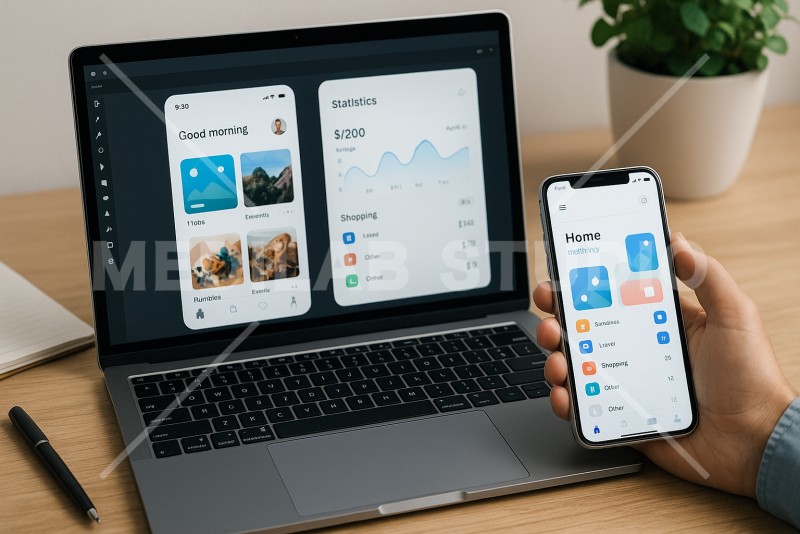 アプリ制作者がスマホ実機でUIを確認しながら、新たなUIについて検討している様子。手元を中心に。