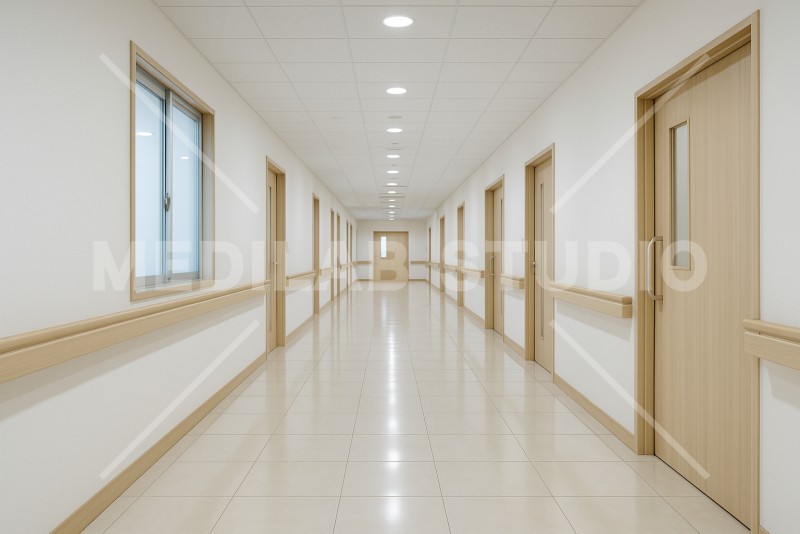 清潔感がある病院の廊下をイメージ。病棟の廊下、あるいは診察室につながる廊下をイメージ。