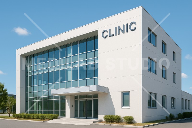 青空の下に建つ大きなクリニックの外観。近代的な建物で清潔感がある。