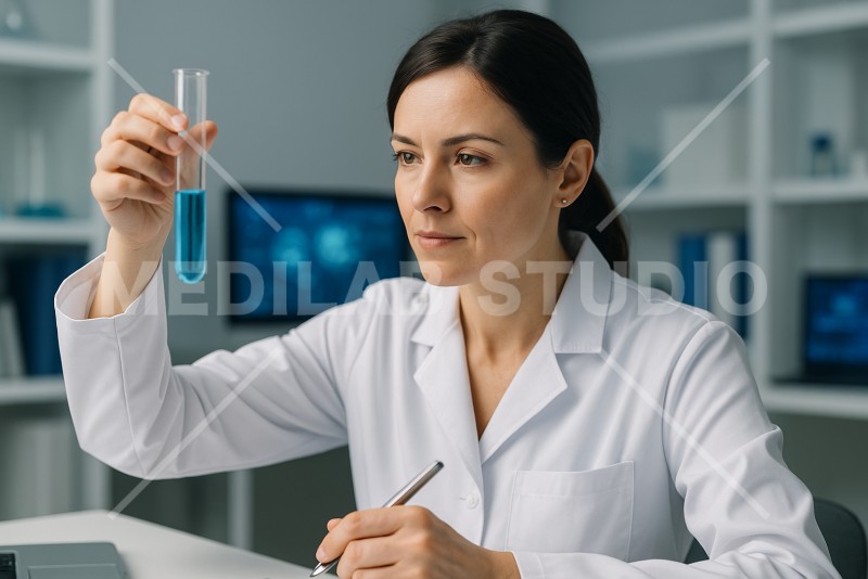 研究室で新薬の開発に従事している研究者。白衣を着用。