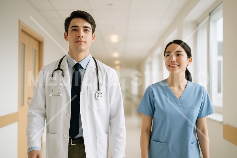 病院の廊下を並んで歩いている医師と検査技師。和やかな様子。