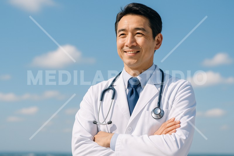 病院の屋上から景色を眺める男性医師。晴天の中でさわやかなイメージ。