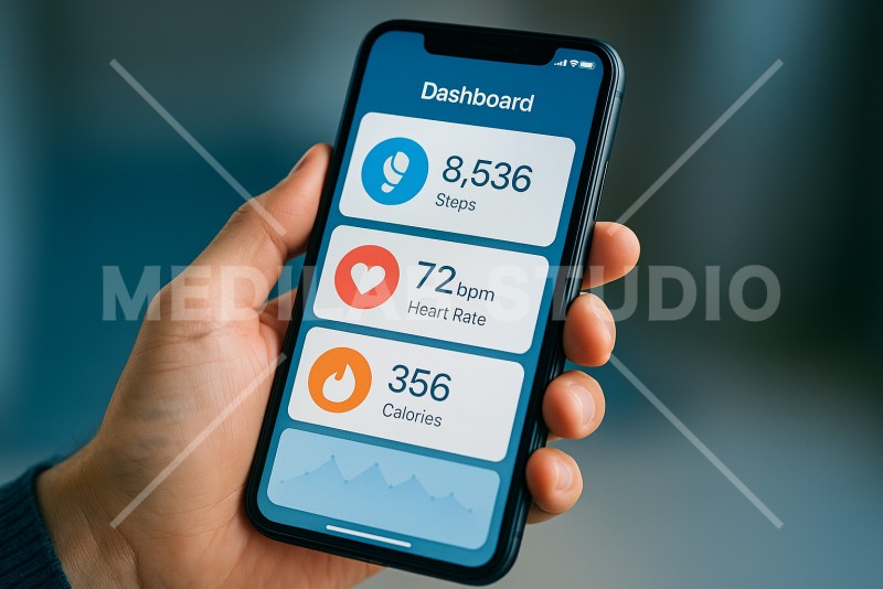 歩数や心拍数、摂取カロリーなどを管理できるアプリを活用している人の手元。