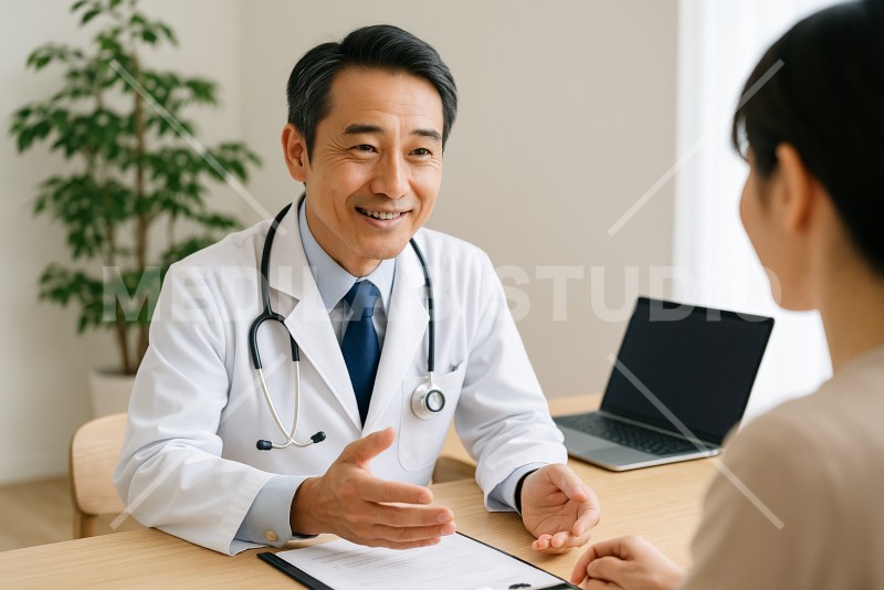健康診断時の医師の問診の様子。和やかで落ち着いた雰囲気。