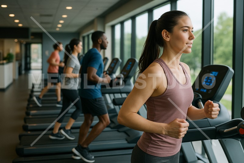 スポーツジムでランニングマシンを使ってエクササイズする人たちです。