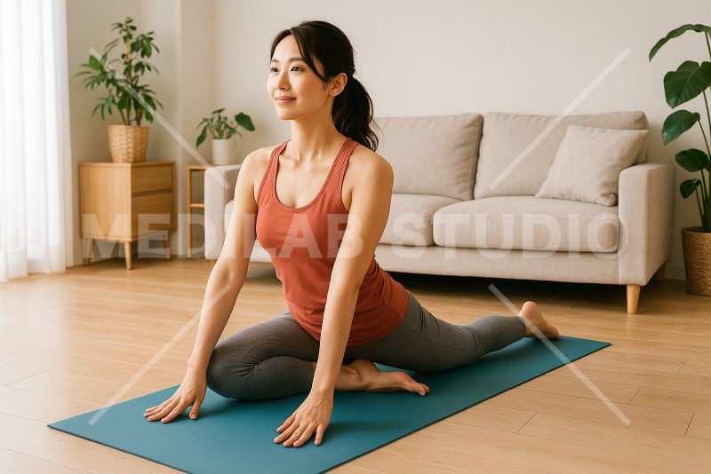 自宅でヨガマットを敷いてヨガエクササイズを行う女性