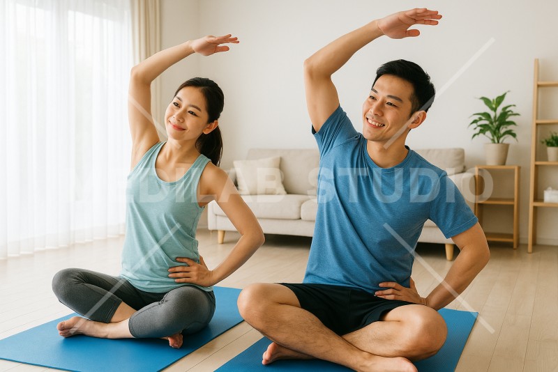 自宅でフィットネスを楽しんでいる夫婦。爽やかな雰囲気。