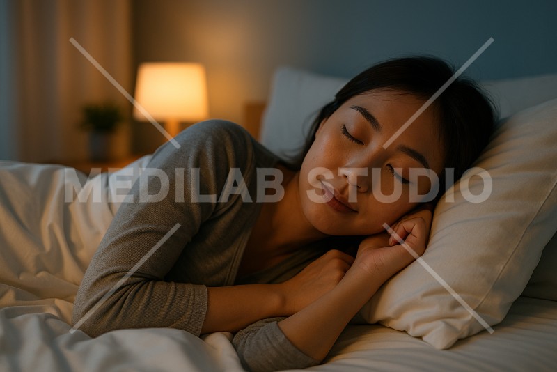 メンタルヘルスのために良質な睡眠を確保している女性の様子。やわらかい表情。