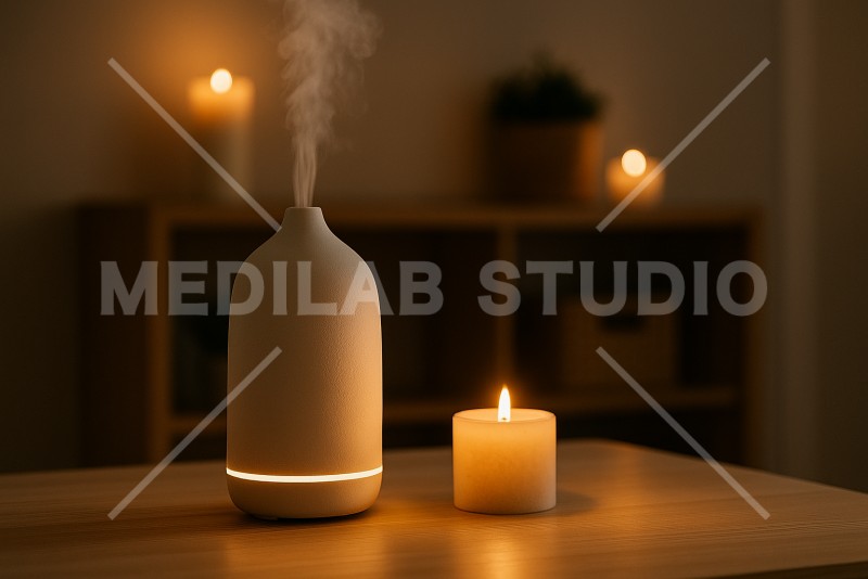 心を落ち着けるためのキャンドルと、よい香りを楽しめるフレグランスミスト。精神的な環境を整えるイメージ。
