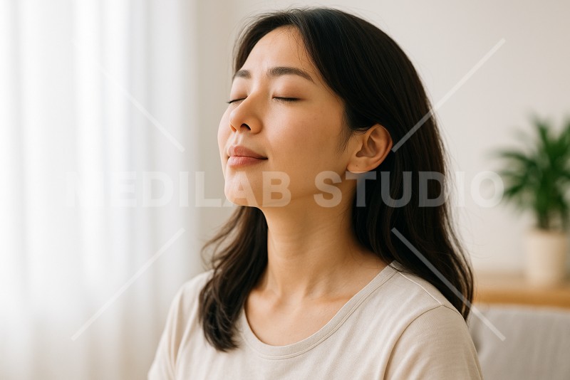 マインドフルネスを意識して呼吸に集中している日本人女性。