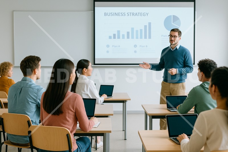 学生が教室でデジタルデバイスを使った授業を受けています。資料はプロジェクターで投影中。