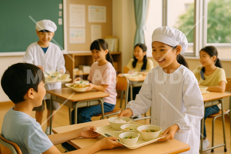 小学校の教室で給食を配膳している様子。和やかな雰囲気。