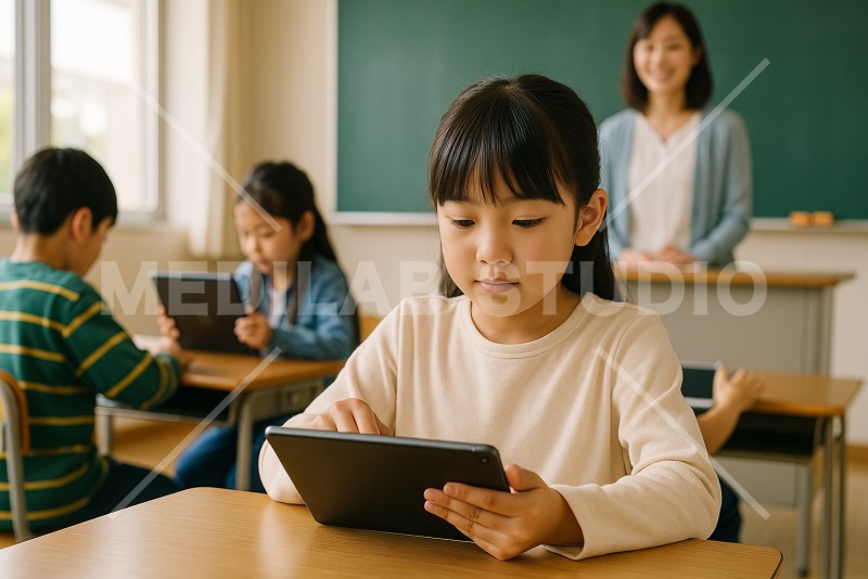 小学校の教室。児童たちがタブレットを使って学習を進めている様子。