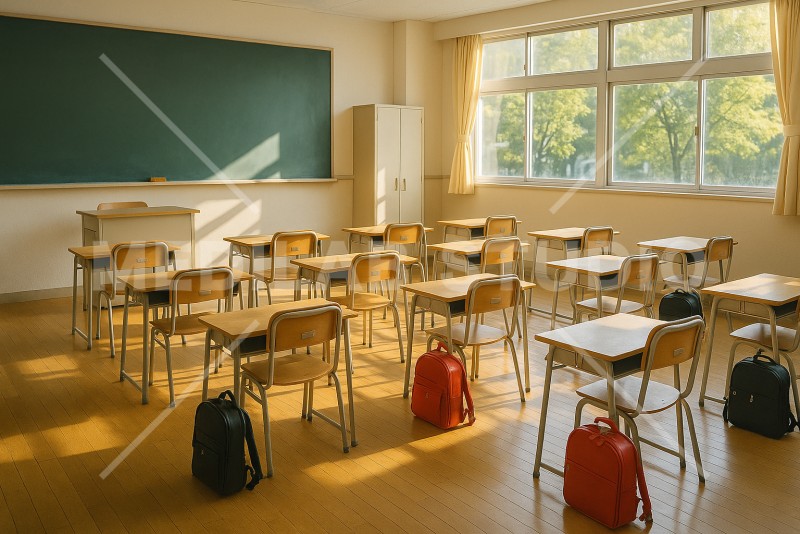 小学校の教室。窓から自然光が差し込んでいる風景。