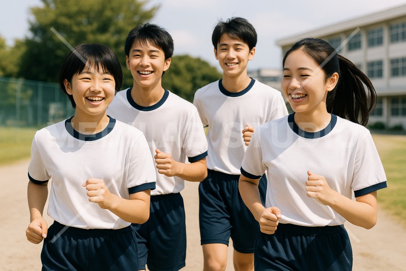 中学校の体育の授業。ランニングをしている中学生たちの和やかな雰囲気のイメージ。