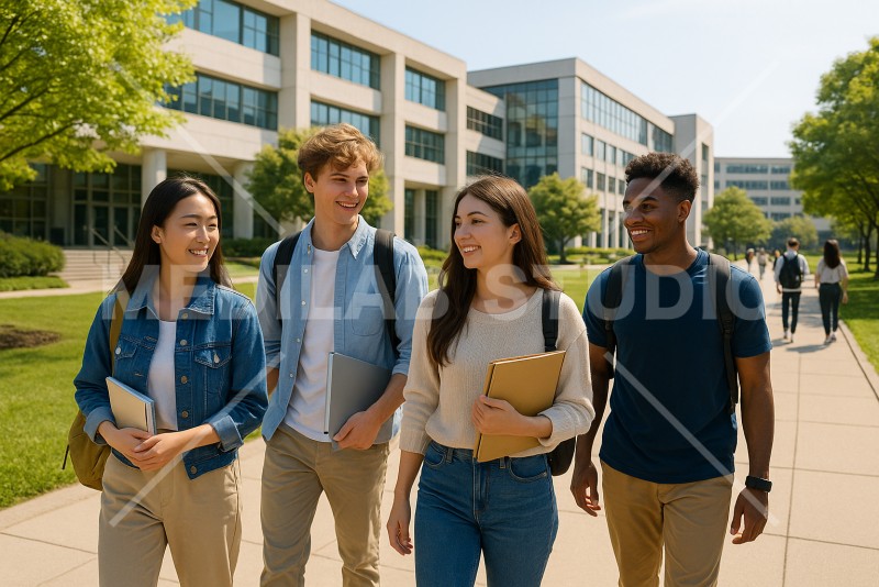 大学のキャンパスを歩く男女学生グループ。和やかな雰囲気。