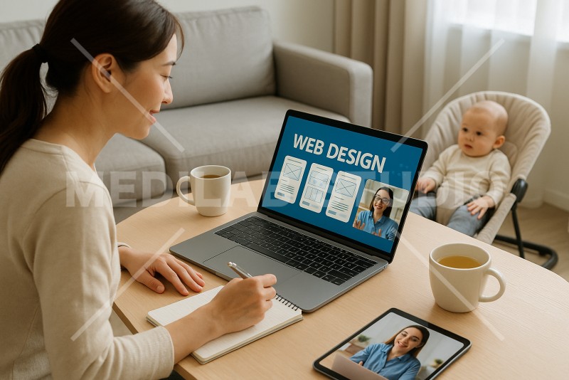 育児中にウェブデザイン講座を受講する女性