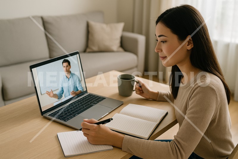女性が自宅にてオンライン講座を受講する様子。ラップトップを活用し紙のノートにしっかりとメモを取っている熱心な学習風景。