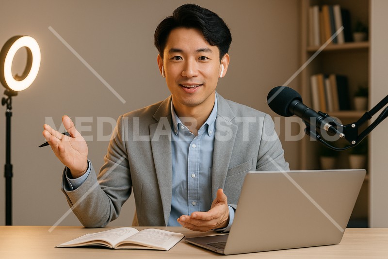 オンライン学習の講師をしている男性。マイクやライトなどの設備を活用している。