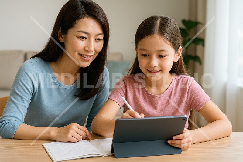 子供向けオンライン教材を活用して、親子が楽しく学習をしている様子。