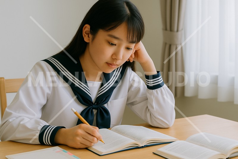 セーラー服姿の女子中学生が熱心に読書をしている様子。メモをするために鉛筆も持っている。