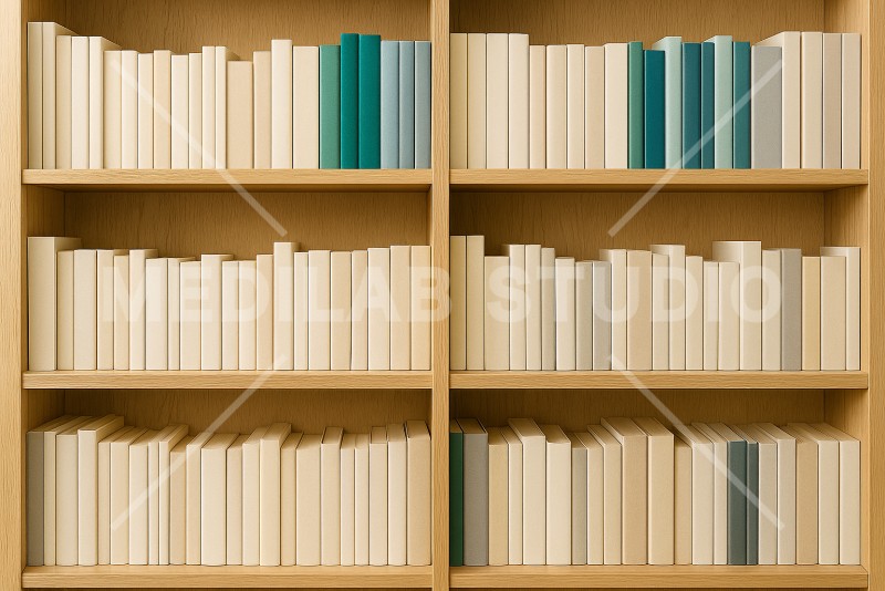 読書家の家にありそうなナチュラルな雰囲気の本棚。さまざまなジャンルの本が並んでいる様子をイメージ。