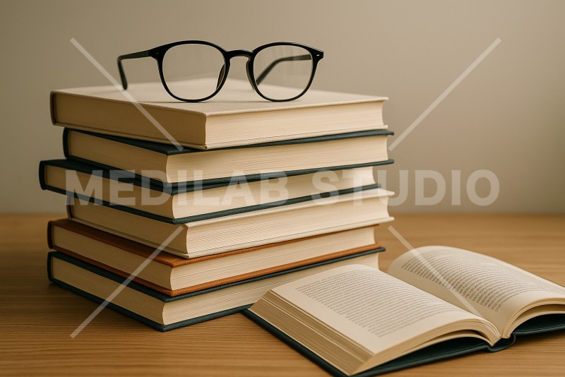 本好きな人の机の上をイメージ。積みあがった書籍の上に眼鏡を置いて一時離席中の状況。