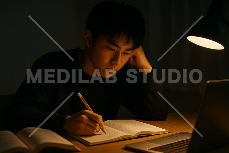 深夜の部屋で勉強をしている男子学生