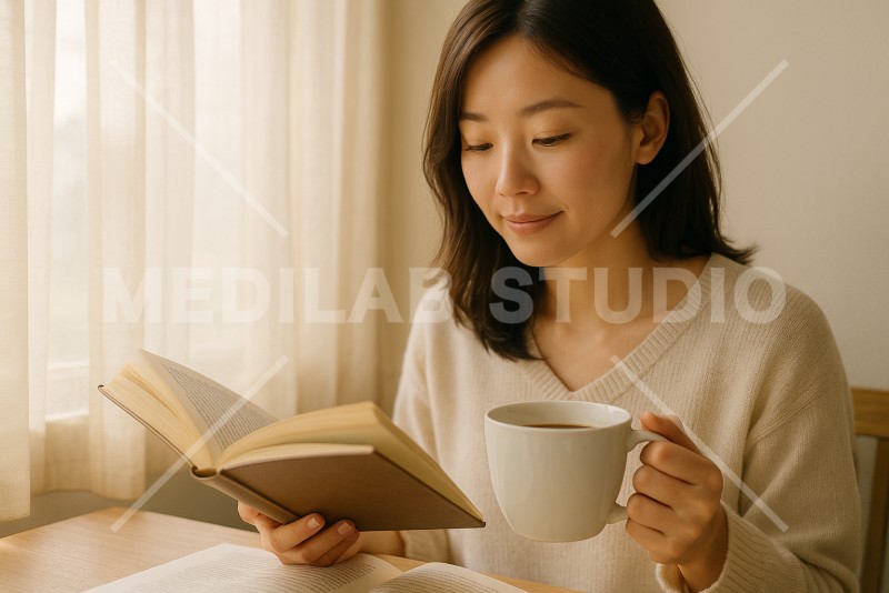 朝、静かなリビングでコーヒーを片手に読書をしている女性。