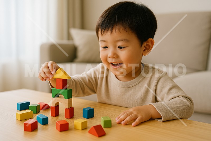 幼い男の子が積み木を使って遊んでいる様子。図形の概念を自然と身に着けている。