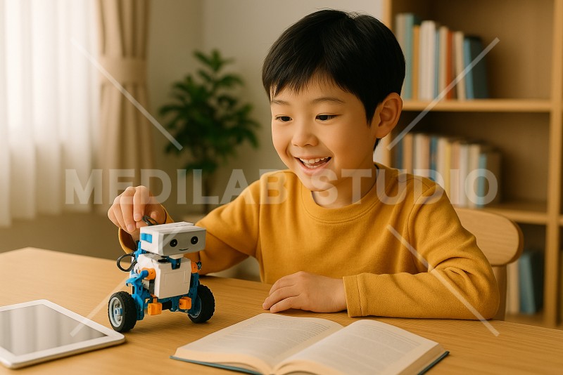 小学生の男の子が自宅でプログラミングロボットを使った学習をしている様子。
