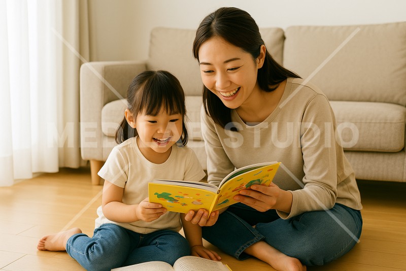 自宅で絵本を楽しんでいる女の子とママ。情操教育に。