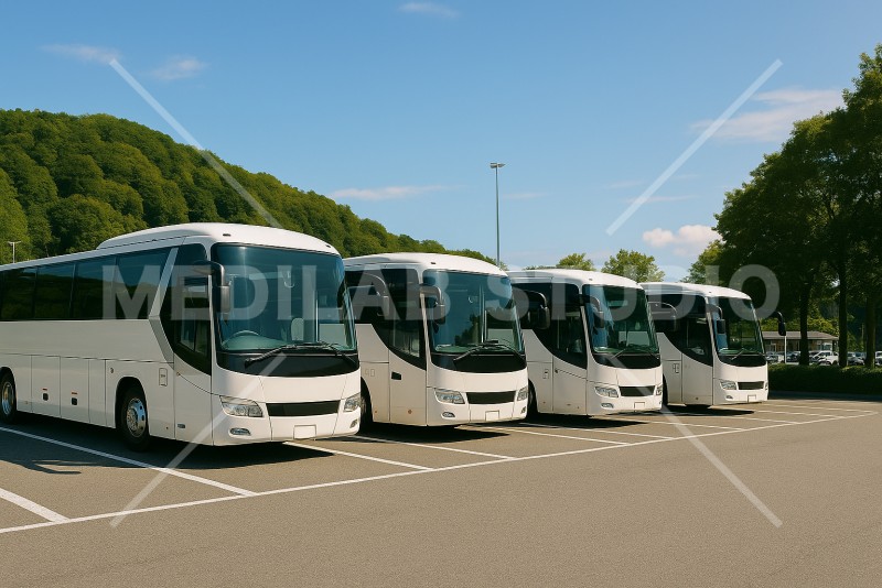 高速道路のパーキングエリアに観光バスが並んでいる様子。
