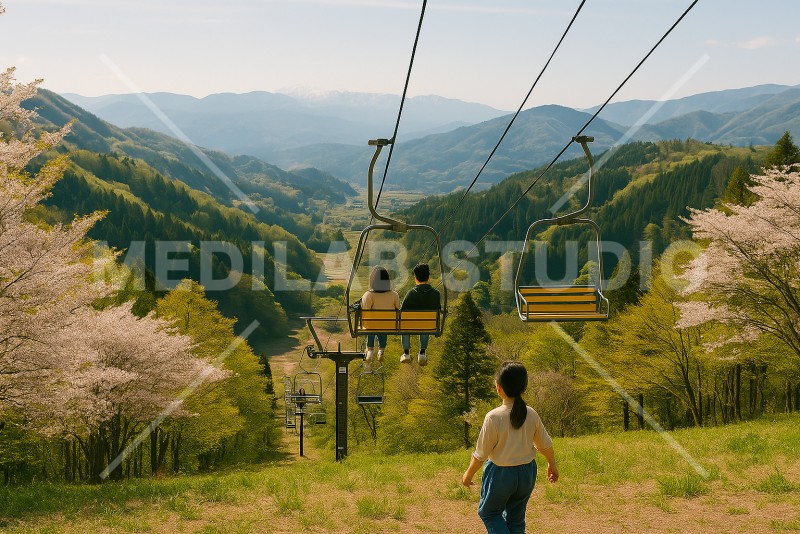 春の山への旅行でリフトを使って観光している様子。桜が咲いている木もある。