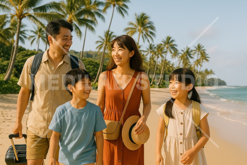 夏に南の島へ観光旅行に出かけた4人家族。ビーチ近くを散歩している様子。