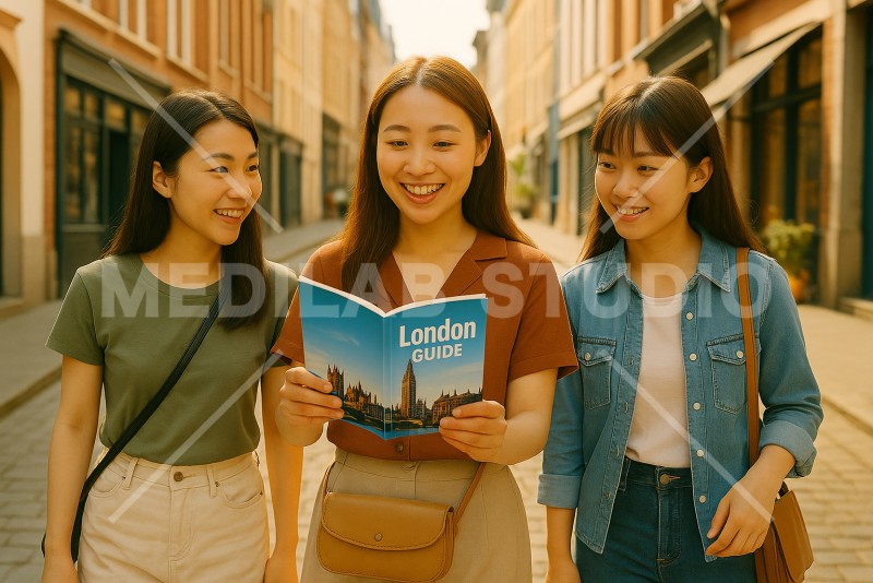 観光の本を見ながらロンドンの街を観光している女性3人グループ。