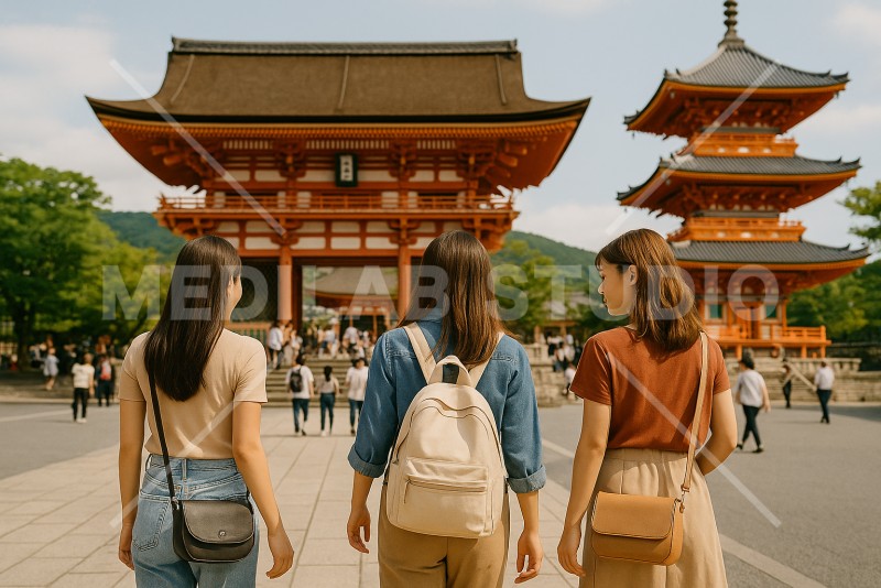 日本の伝統的な寺院を観光している若い女性3人組の後ろ姿。観光客でにぎわっている。