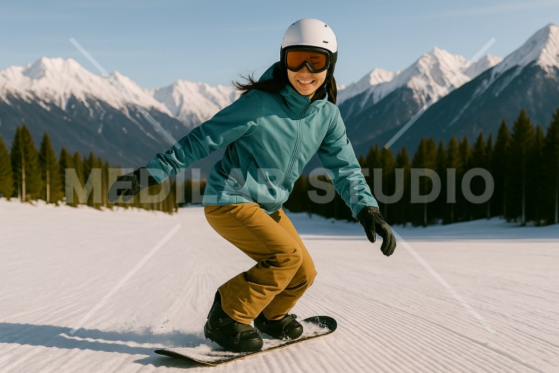 スノーボードを楽しんでいる女性。ターンをしているイメージ。