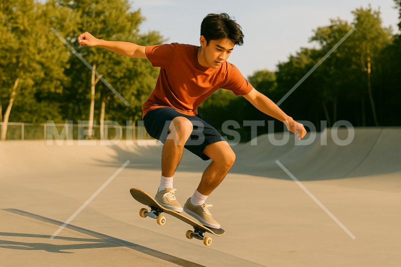 スケートボードを楽しむ男性。ジャンプ技をきめているところ。