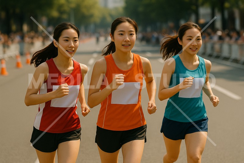 マラソンで走っている3人の女性。それぞれユニフォームの色が違い別チームのイメージ。