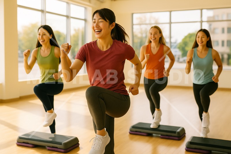 女性たちがフィットネスクラブのスタジオプログラムでエアロビクスを楽しんでいる様子。