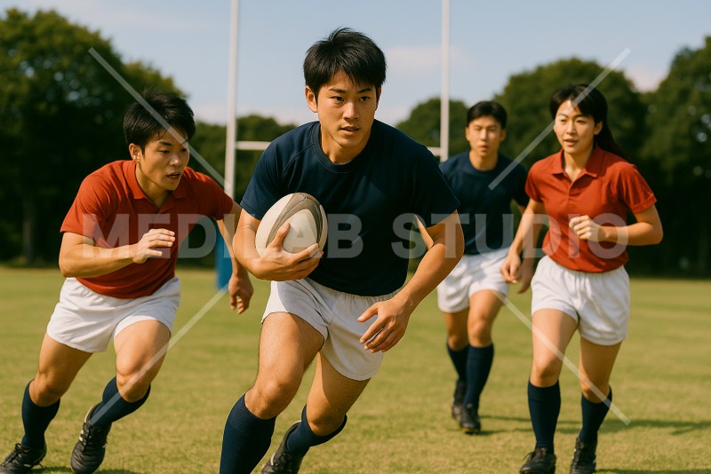 男子ラグビー部が活動している様子。高校生くらい。真剣で熱い雰囲気。