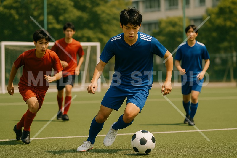 男子サッカー部が活動している様子。人工芝のグラウンドで真剣な雰囲気。
