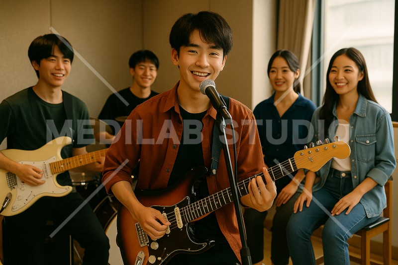 学生の軽音部員が集まって練習している様子。笑顔で和やかな雰囲気。