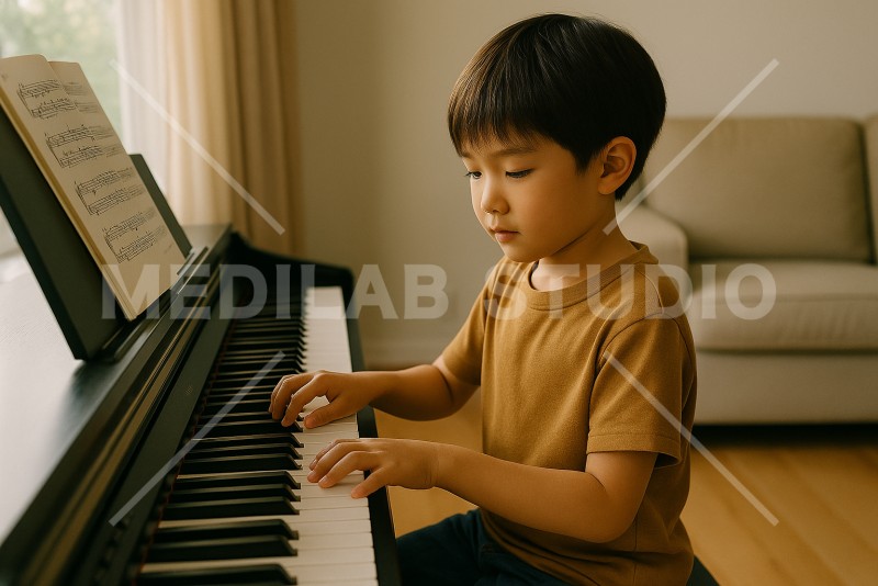 小学生くらいの男の子が自宅でピアノの練習をしている様子。放課後の夕方をイメージ。