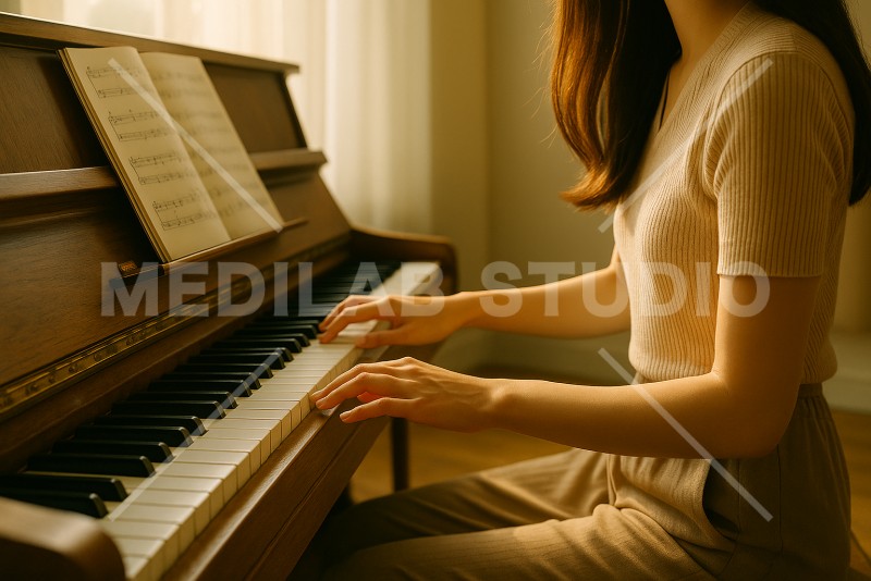 女性が自宅でピアノの練習をしている様子。手元中心。夕方をイメージ。