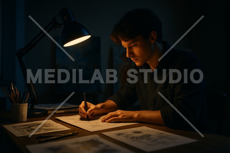夜のデスクでライトを照らし、創作活動に専念する男性。静かで真剣な雰囲気。