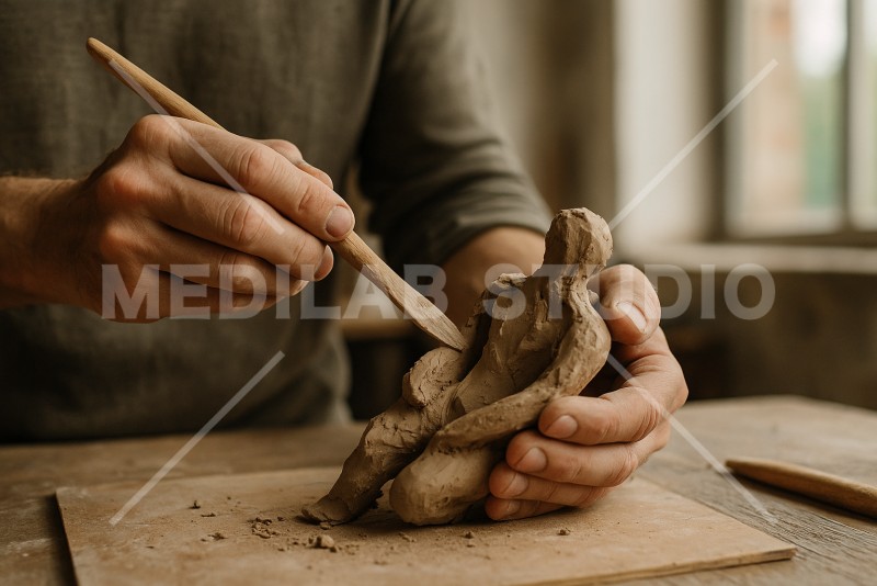 粘土を加工して彫刻のようなものを作成している男性の手元。モダンな作品を制作中。