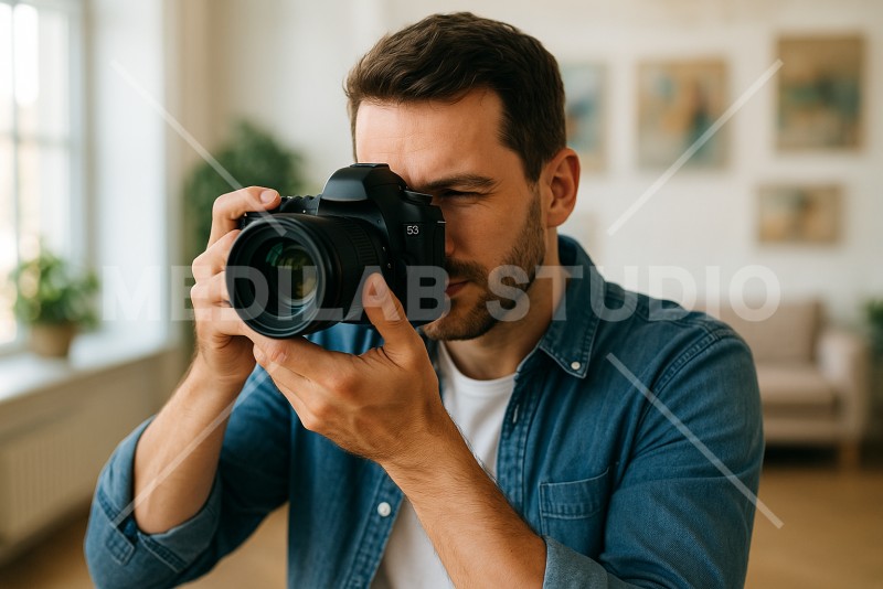 外国人のフォトグラファー男性が何かを撮影している様子。明るいリビングのような場所。