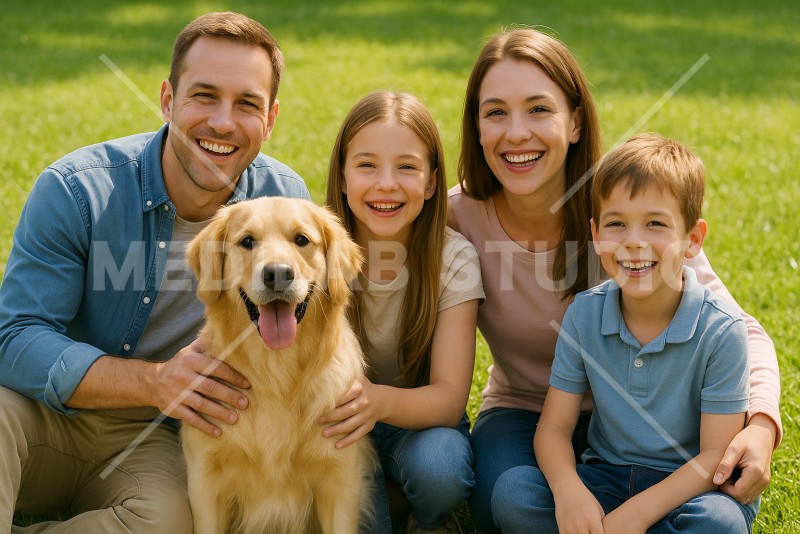 大型犬(ゴールデンレトリバー)を飼っている外国人一家の集合写真。芝生の上でさわやかなイメージ。